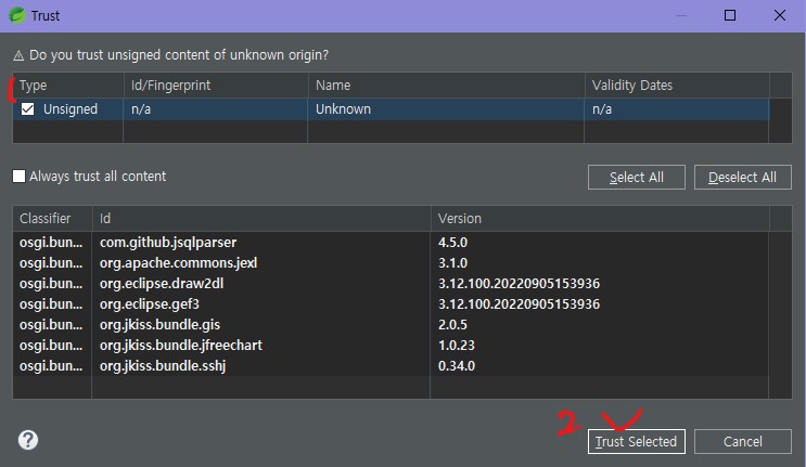 5) Unsinged를 체크하고 하단에 있는 Trust Selected를 눌러줍니다.