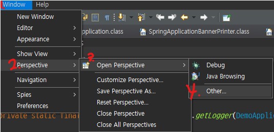 7) 이클립스 상단의 메뉴바에서 Window - Perspective - Open Perspective - Other에 들어갑니다.