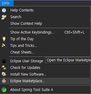 1) 이클립스 상단의 메뉴바에서 Help - Eclipse Marketplace에 들어갑니다.